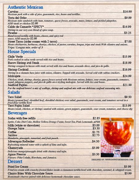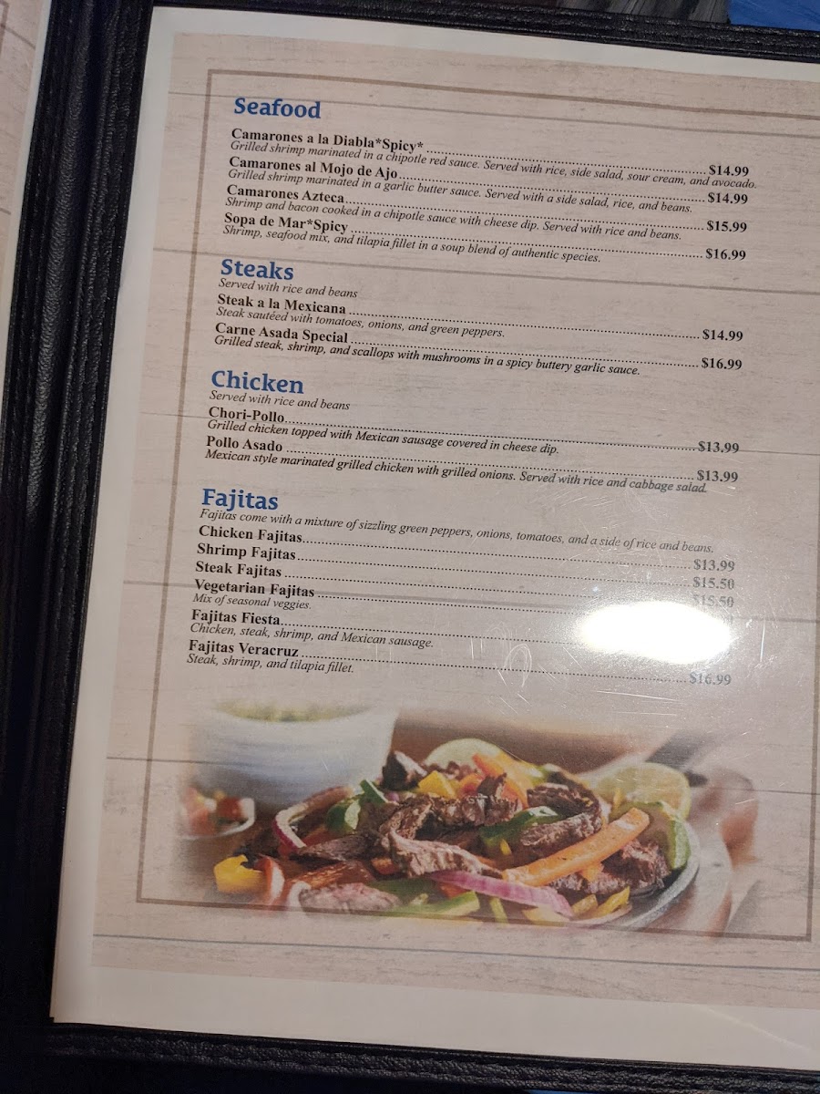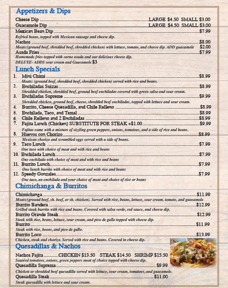 Sautéed tomatoes, onion, peppers and choice of meat topped with cheese dip: $13.50 chicken $14.50 steak $15.50 shrimp